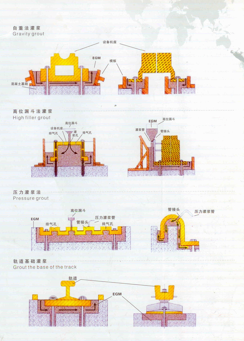 6)灌浆过程中如发现表面有泌水现象,可布撒少量EGM干料,吸干水份。 |